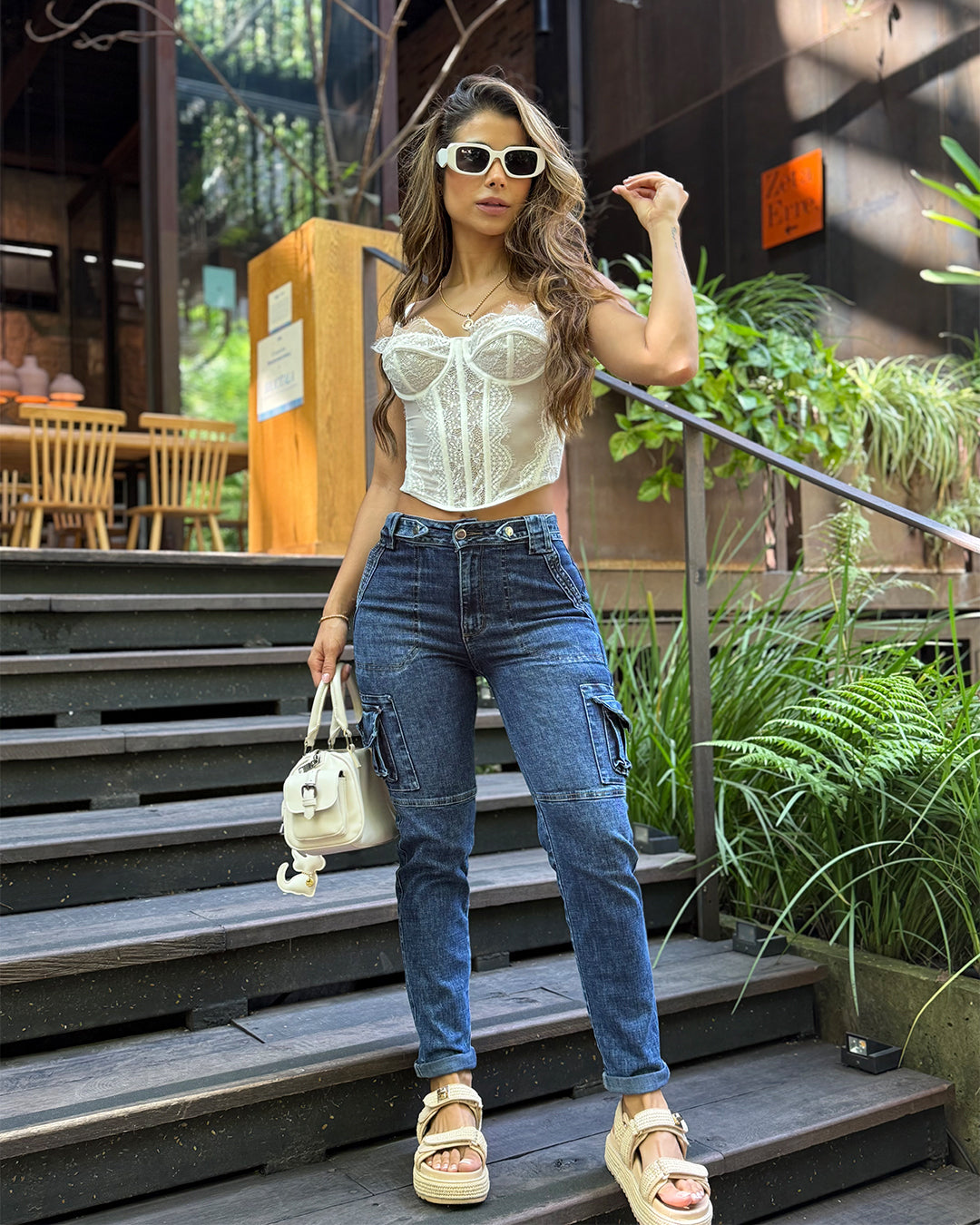 Este jean cargo combina lo mejor del estilo urbano con la comodidad del denim. Confeccionado en mezclilla de excelente calidad, cuenta con un ajuste moderno de tiro alto, múltiples bolsillos laterales estilo cargo y detalles de costuras que lo hacen único. Su tono azul oscuro lavado realza el diseño y lo convierte en una prenda versátil y atemporal.