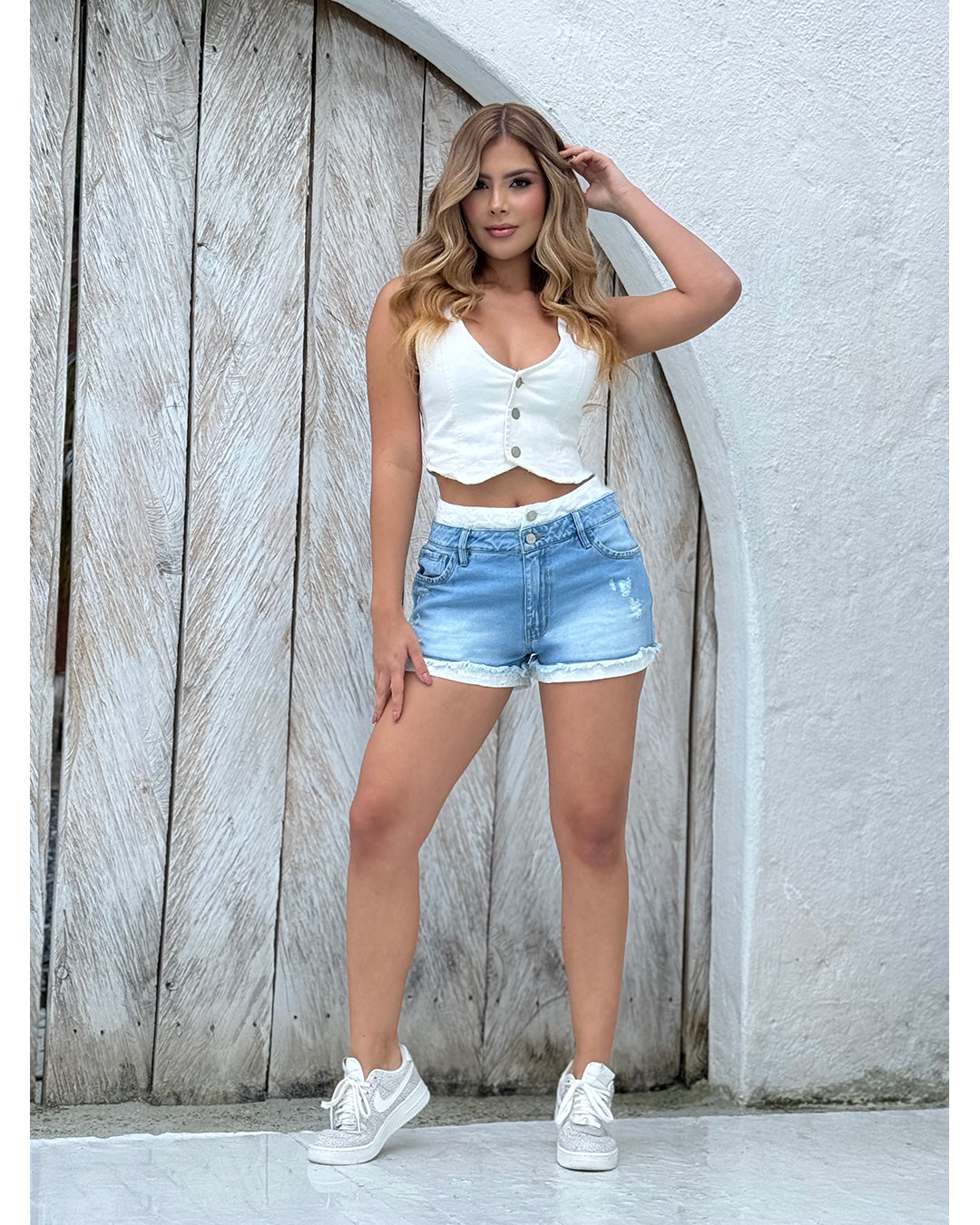 Este short corto combina el estilo urbano del denim con la delicadeza del ojalillo blanco, creando una prenda única y femenina. Su tono azul hielo añade un toque casual perfecto para el dia a dia o vacaciones. El remate inferior con dobladillo de encaje tipo ojalillo aporta ese aire romántico y fresco que lo convierte en un imprescindible para cualquier armario.