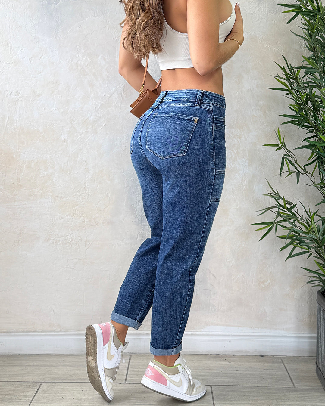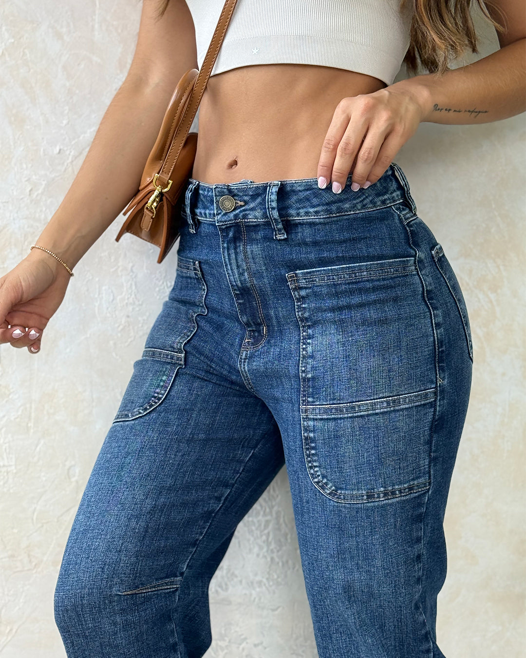 Renueva tus outfits casuales con este jean cargo en denim azul oscuro, diseñado para ofrecer comodidad, estilo y un toque urbano. Su corte relajado con bota doblada le da un aire moderno, mientras que los bolsillos cargo frontales aportan funcionalidad y un look contemporáneo.
